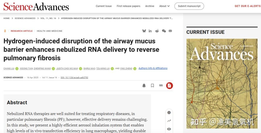 学者们使用潓美氢氧气机开展了相关研究,取得了重大突破,为逆转肺纤维(PF)提供了临床可行策略,并在国际顶尖期刊《Science Advances》上成功发表[1]。(详见)